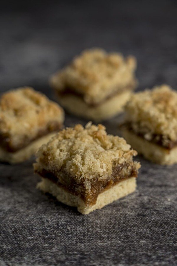 Masa bretón, dulce de leche y crocante de coco natural.