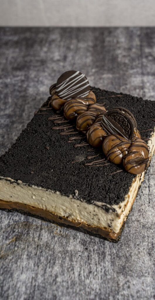 Base de galletas Oreo, mousse de queso crema y dulce de leche natural.