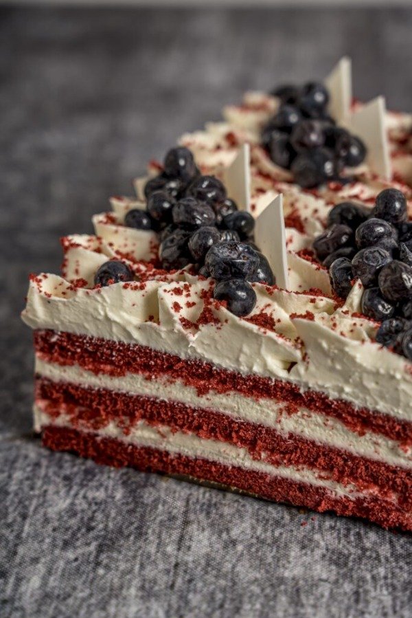 Capas de bizcocho red, cream cheese frosting, chantilly y frutos rojos.
