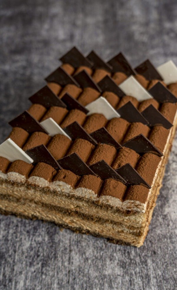 Biscuits de vainilla humedecidas con almibar de café, mousse de queso y cacao.