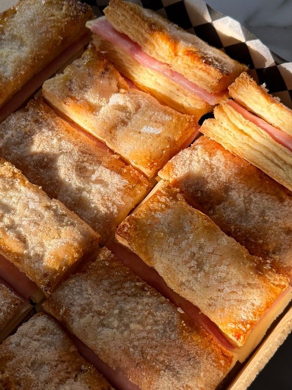 Masa hojaldrada crocante rellena con jamón y queso fundido. Un bocado clásico, dorado y tentador para mesas de finger food.