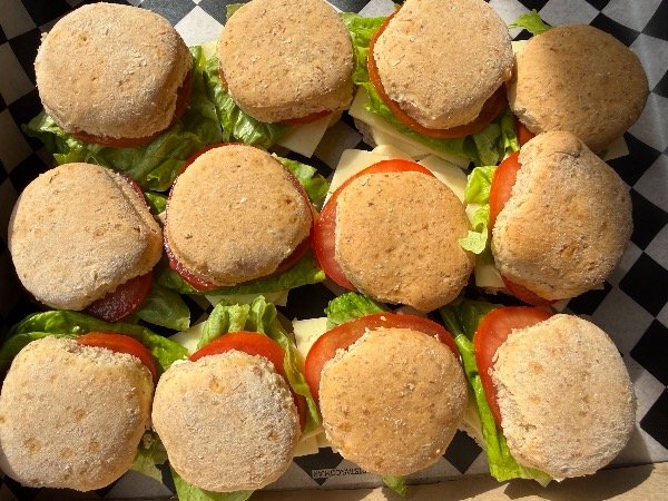 Pan integral suave relleno con tomate fresco, lechuga y queso. Un bocado liviano y fresco, pensado para opciones más equilibradas dentro del finger food.