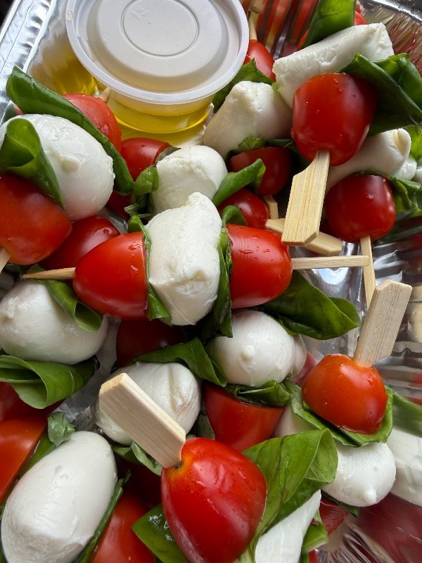 Pinchos frescos con bocconcino, tomate cherry y albahaca. Una opción liviana, elegante y colorida para mesas de finger food. Acompañados de aceite de oliva.