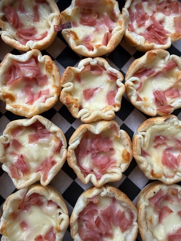 Canastitas crocantes rellenas de jamón y mozzarella fundida. Un clásico cálido y sabroso, ideal para eventos y reuniones.